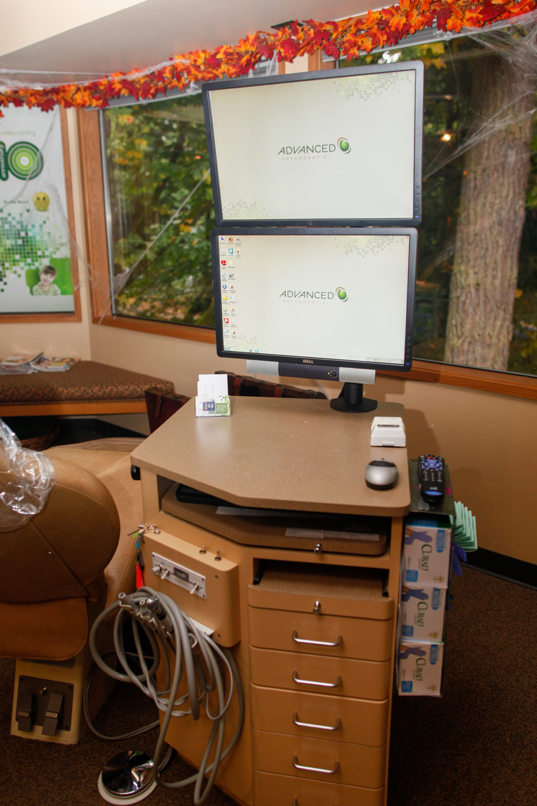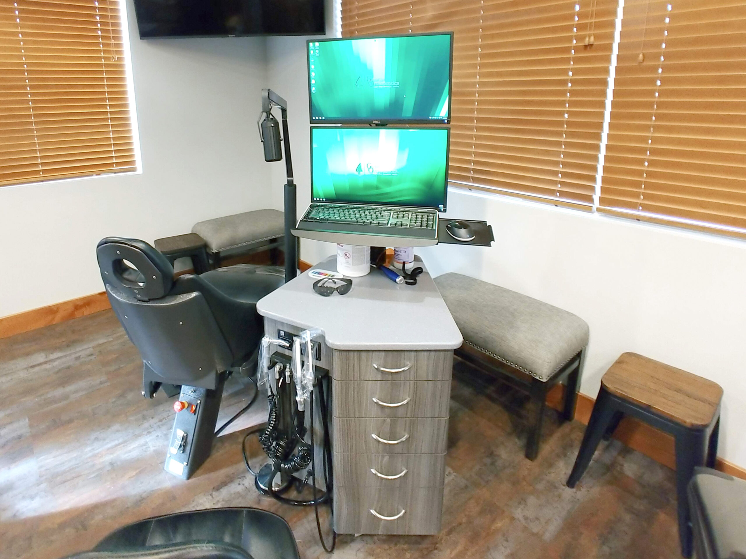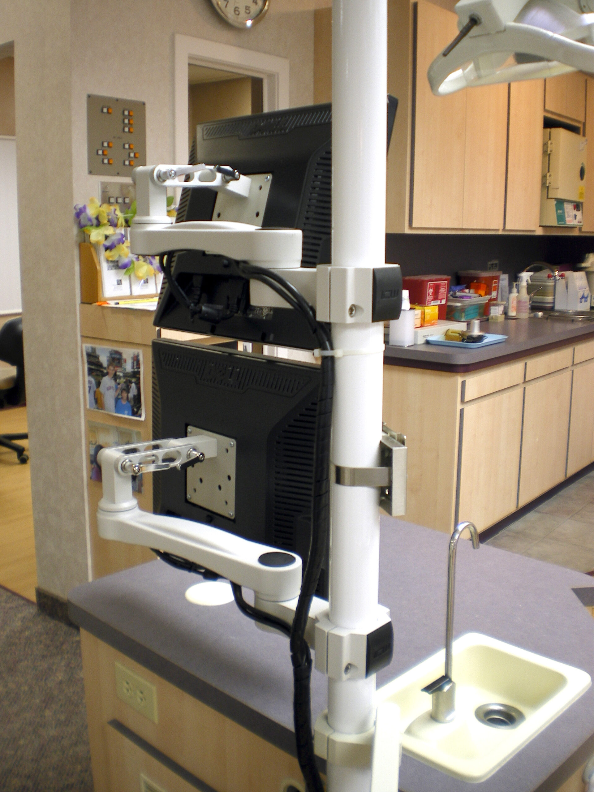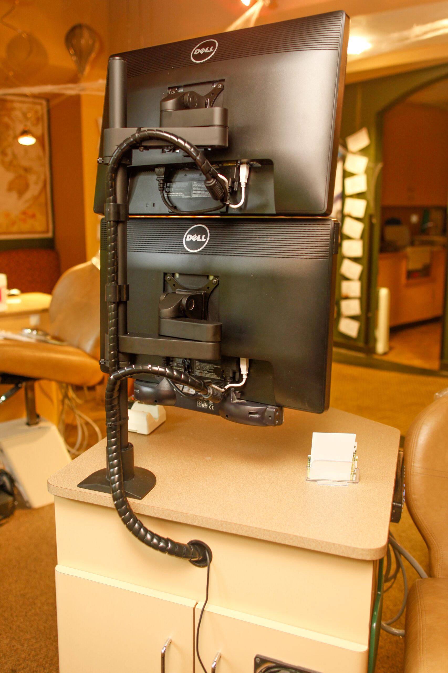 Stacking two monitors is a clean way to minimize the width of the chairside unit while still allowing for plenty of content.