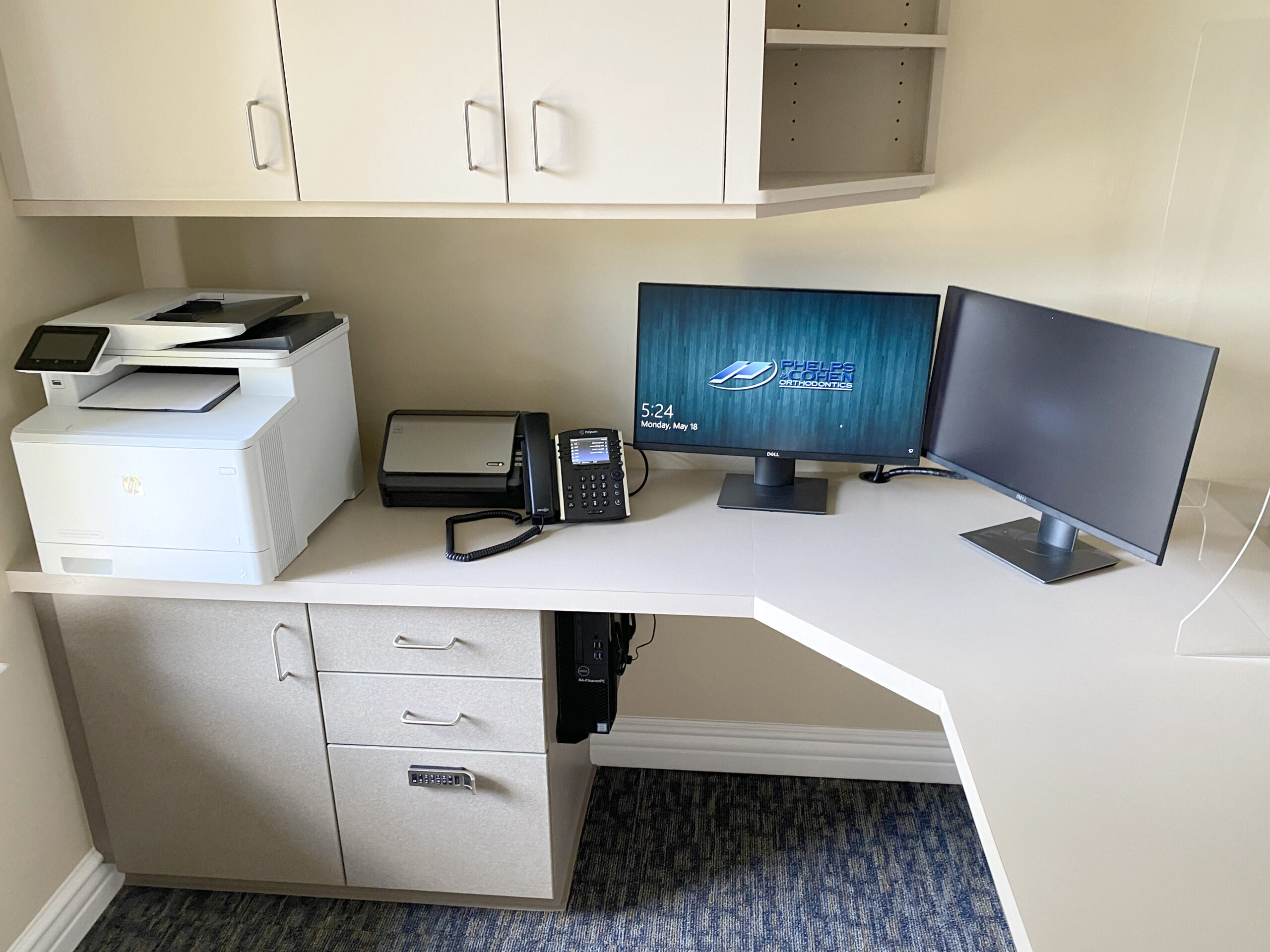 Scanners, printers, signature pads are integrated into this space.