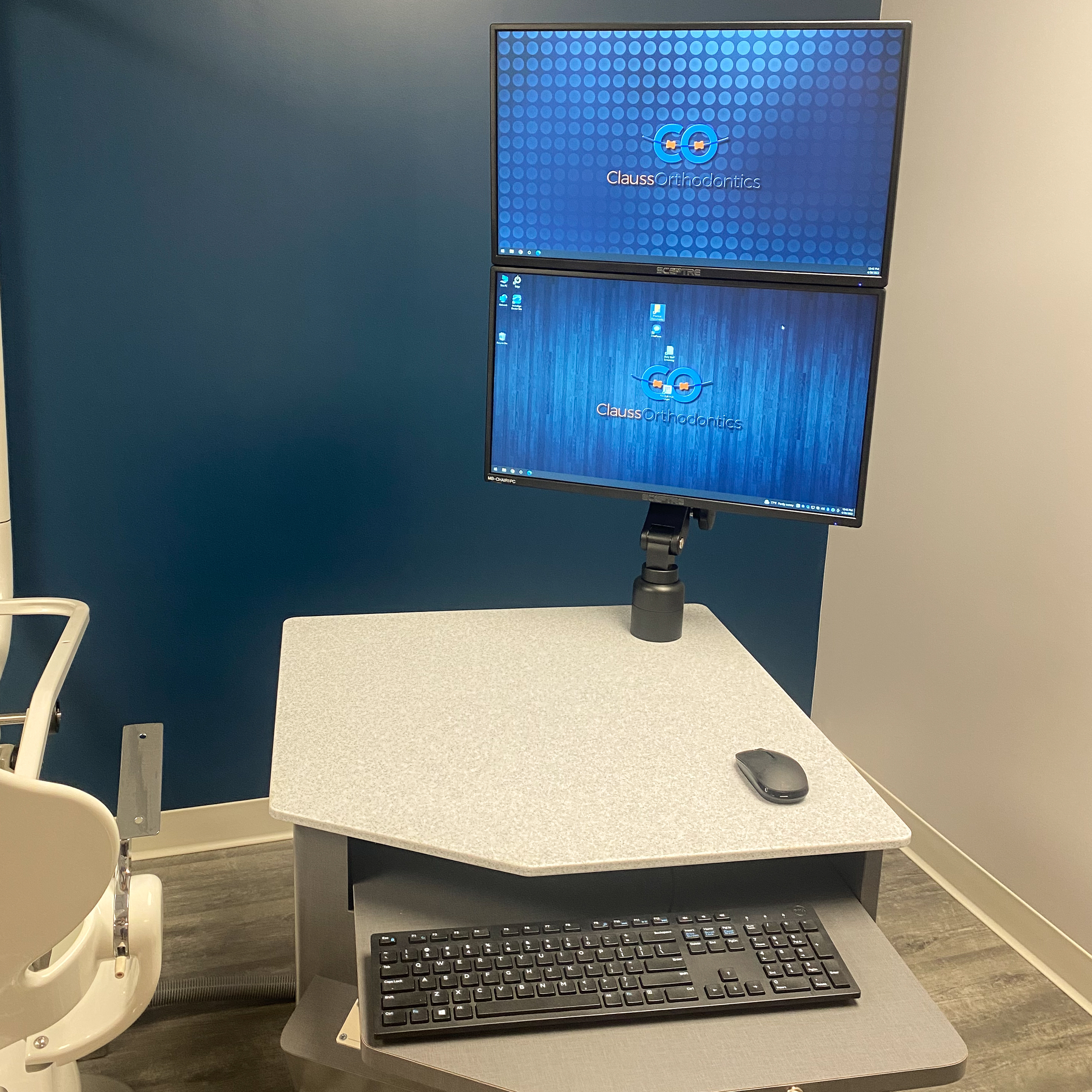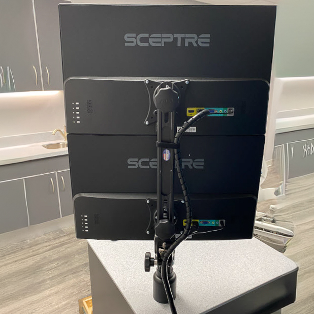 The black displays and hidden cabling keep the setup sleek and clutter-free, while a custom-cut ICW mount was tailored to the doctor’s exact viewing height and angle preferences—perfectly matching the streamlined, professional look of the space.